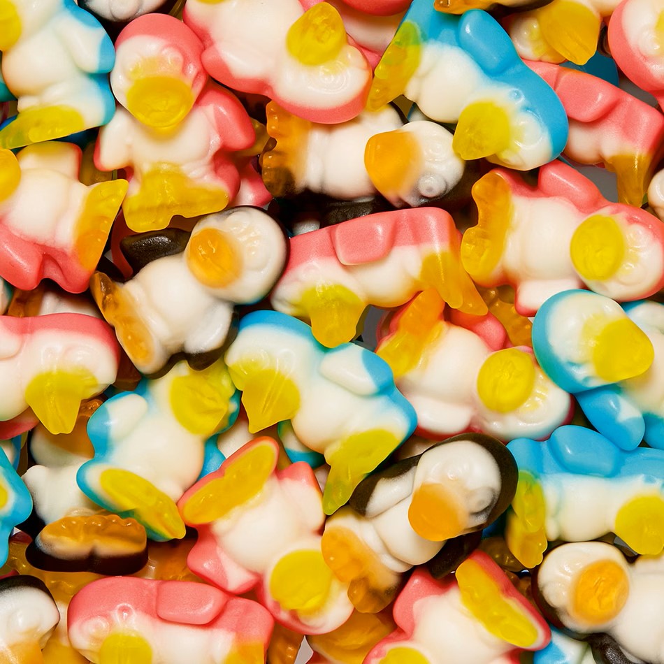 Αυτοί οι διασκεδαστικοί, έντονα χρωματιστοί πιγκουίνοι λικνίζονται σε φρουτώδεις γεύσεις σμέουρων, φράουλας, σταφίδας και κόκκινων μούρων. Στα ζώα της αγέλης δεν αρέσει να μένουν μόνα τους — προτιμούν να τρώνε σνακ μαζί! Και το καλύτερο; Τα Trolli Pingummis μπορούν να σταθούν μόνα τους!